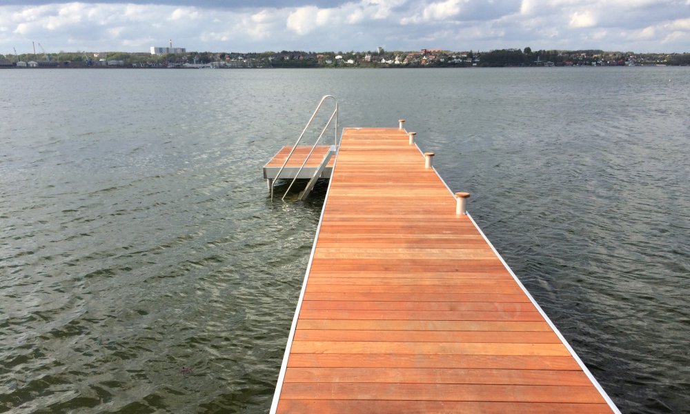 Bade- og bådebroer fra Modulbro er opbygget af moduler i saltvandbestandig aluminium (speciel legering) og miljøvenlige træsorter. Sorten af træbelægning vælges individuelt. Vi leverer i lærketræ eller andre miljøvenlige træsorter og alle bolte og skruer er rustfrie.